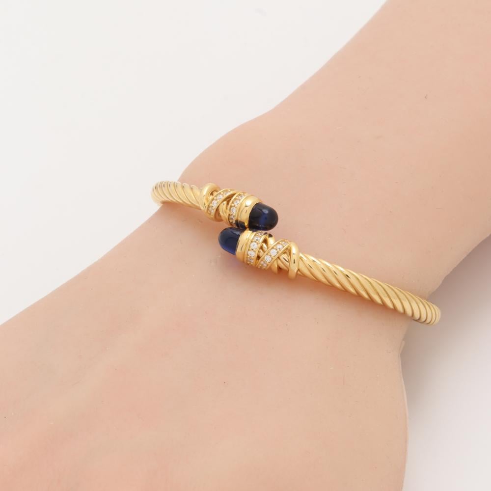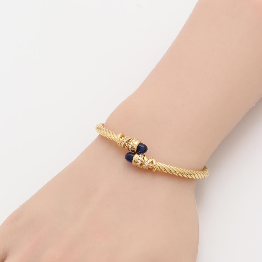 تتميّز بتصميم حلزوني فاخر من الذهب، تنتهي بقطعتين بيضاويتين بلون أزرق داكن (أقرب للـ"ياقوت الأزرق")، مُزينة بفصوص لامعة تلتف حول كل طرف بأسلوب أنيق وجذاب. تصميمها يجمع بين القوة والأنوثة والفخامة الملكية.