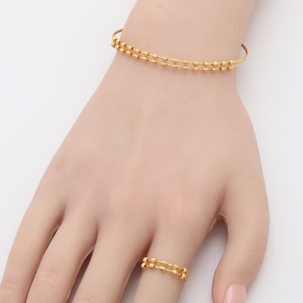 مصنوع من ذهب عيار 21 قيراطًا، يجمع هذا الطقم بين السوار والخاتم بنقوش هندسية أنيقة تمنحه طابعًا عصريًا بروح فنية دقيقة.