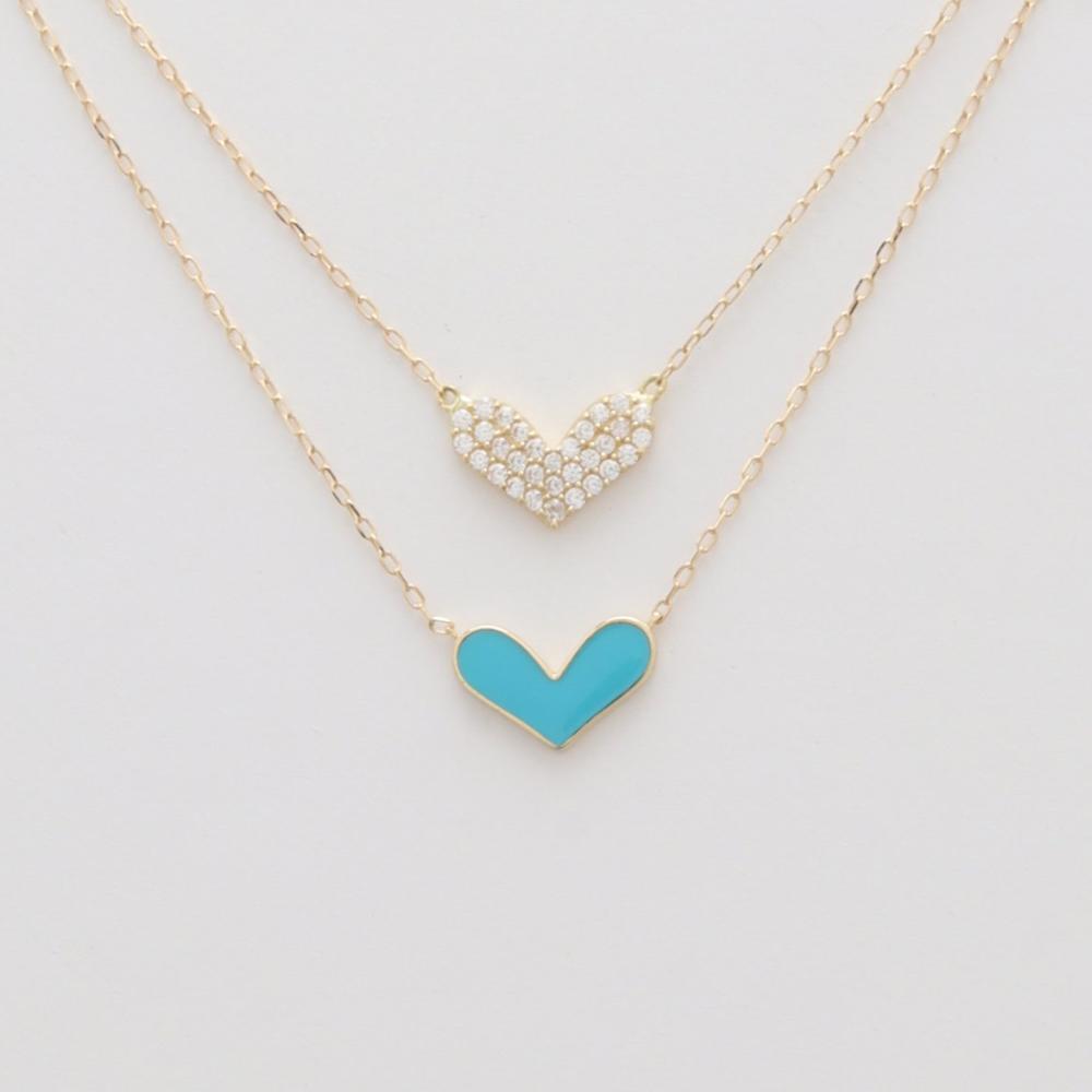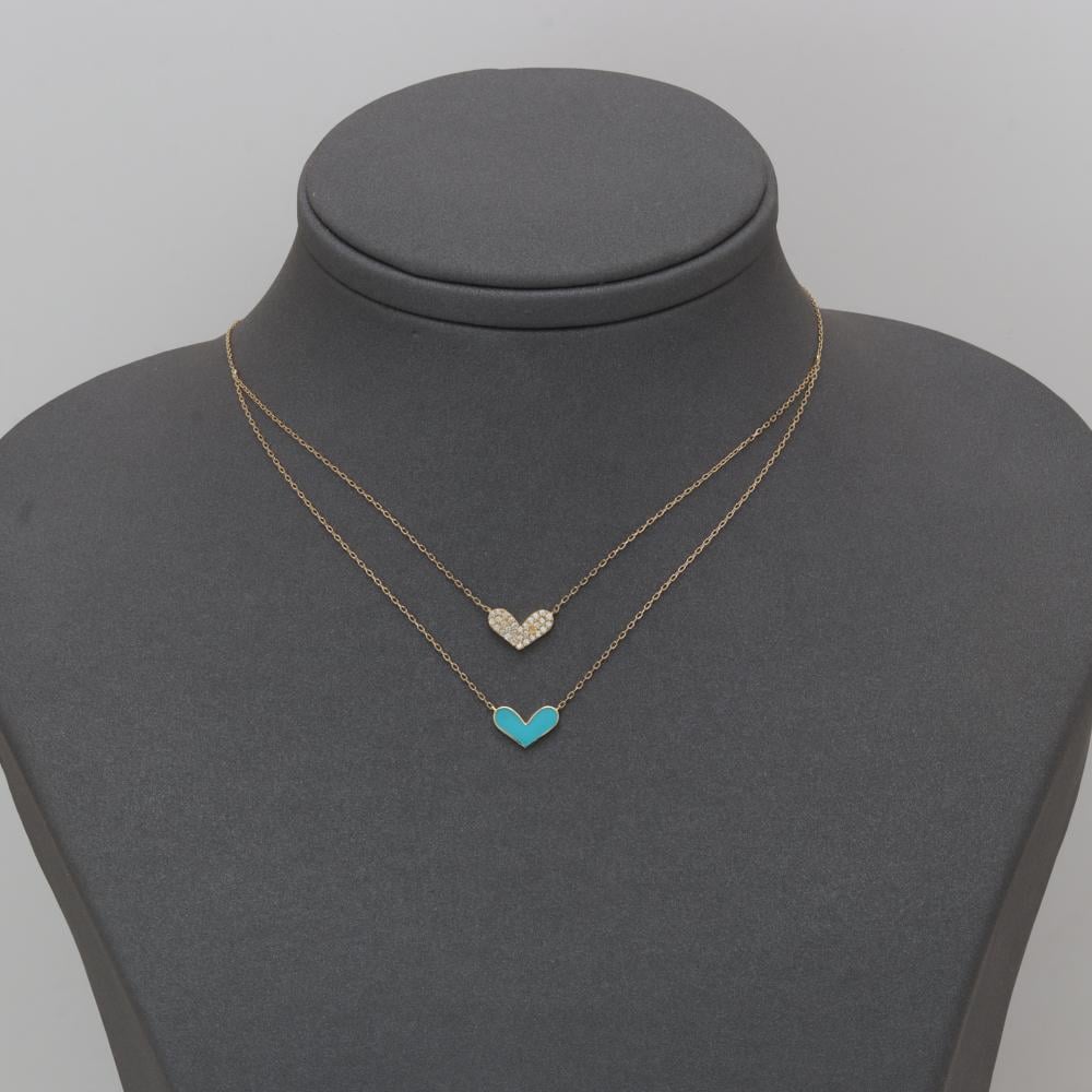 عقد ذهبي أنيق يتكوّن من طبقتين تنسدل كل منهما بانسيابية ناعمة كهمسة مشاعر، تُجسد فيه التفاصيل رقة الحب وعمق الإحساس.
